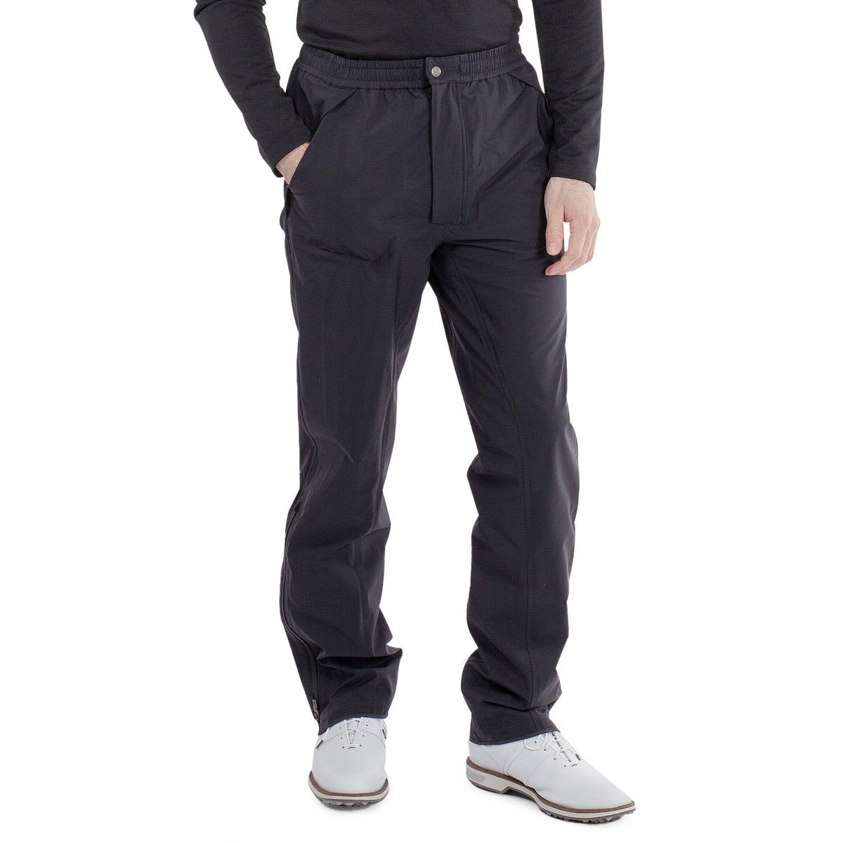 Elasticated waist with a drawstring and adjustable leg width at the hem ensure a tailored, comfortable fit over your regular golf attire or base layers.