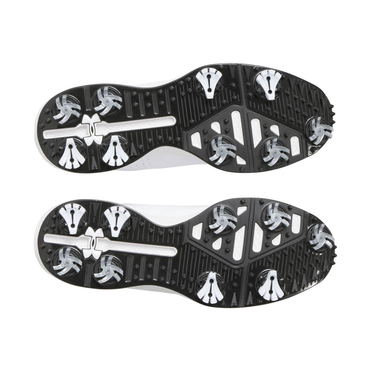 -UA Swing Support System (S3) provides smarter traction, dual-foam cushioning & lockdown lacing -Swing Support Strap combines with reinforcement in the upper to provide biomechanically correct lock-in -Energy-returning UA HOVR™ foam + supportive Charged Cushioning® guides natural motion of the foot in a golf swing -New UA S3 spikes—designed with Softspikes® & a golf biomechanist—for game-changing directional traction -Outsole has strategic flex grooves, secondary traction & TPU up the side for added support at impact -Updated fit with more room at the ball of the foot for improved comfort & stability -Breathable, supportive engineered microfiber upper & full waterproof membrane -Molded sockliner for enhanced fit & comfort