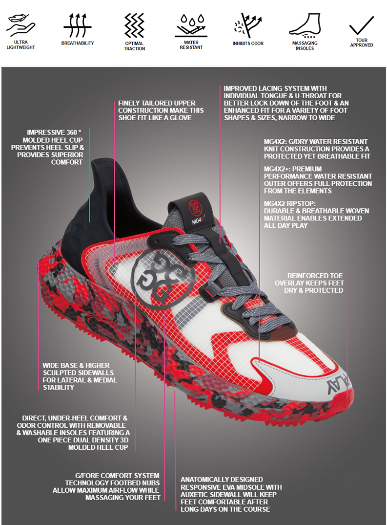 Men 's MG4X2 니트 골프 크로스 트레이너는 거리에서 코스로 쉽게 안내하는 다기능 신발입니다. 결실 할 수없는 편안함을위한 일체형 엔지니어링 방수 G/드라이 니트 상단, 하루 종일지지를위한 보조 격자 미드솔, 그립을위한 톱니 트랙션 패턴, G/Fore의 스테이플 트리플 밀도 폼 쿠션 풋브로 마사지를 위해 마사지를합니다.