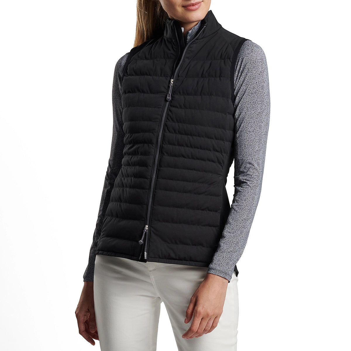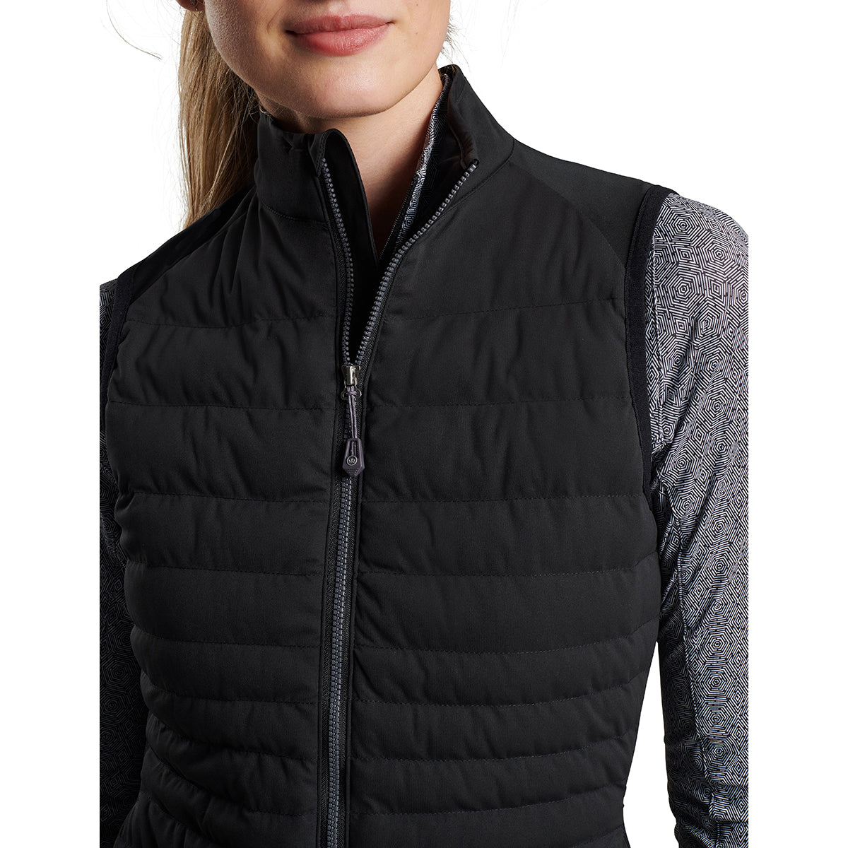 100% 폴리에스터 외피와 87% 폴리에스터/13% 스판덱스 측면 패널로 구성된 여성용 조끼