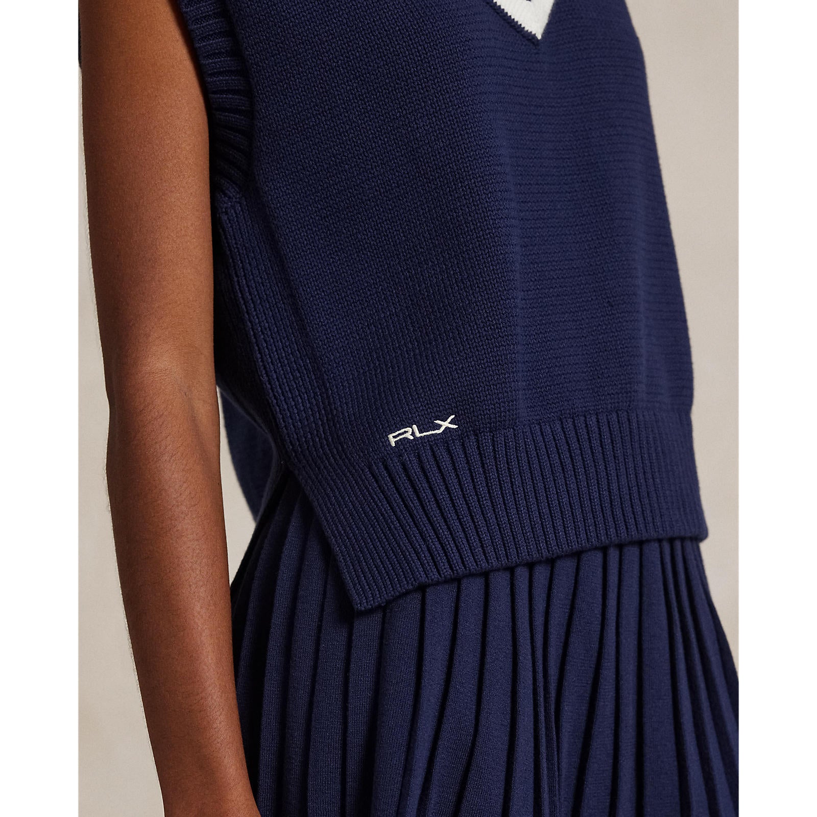RLX RALPH LAUREN 여성 면화 V 목 슬리빙 스웨터 조끼 - 정제 된 해군/세라믹 화이트