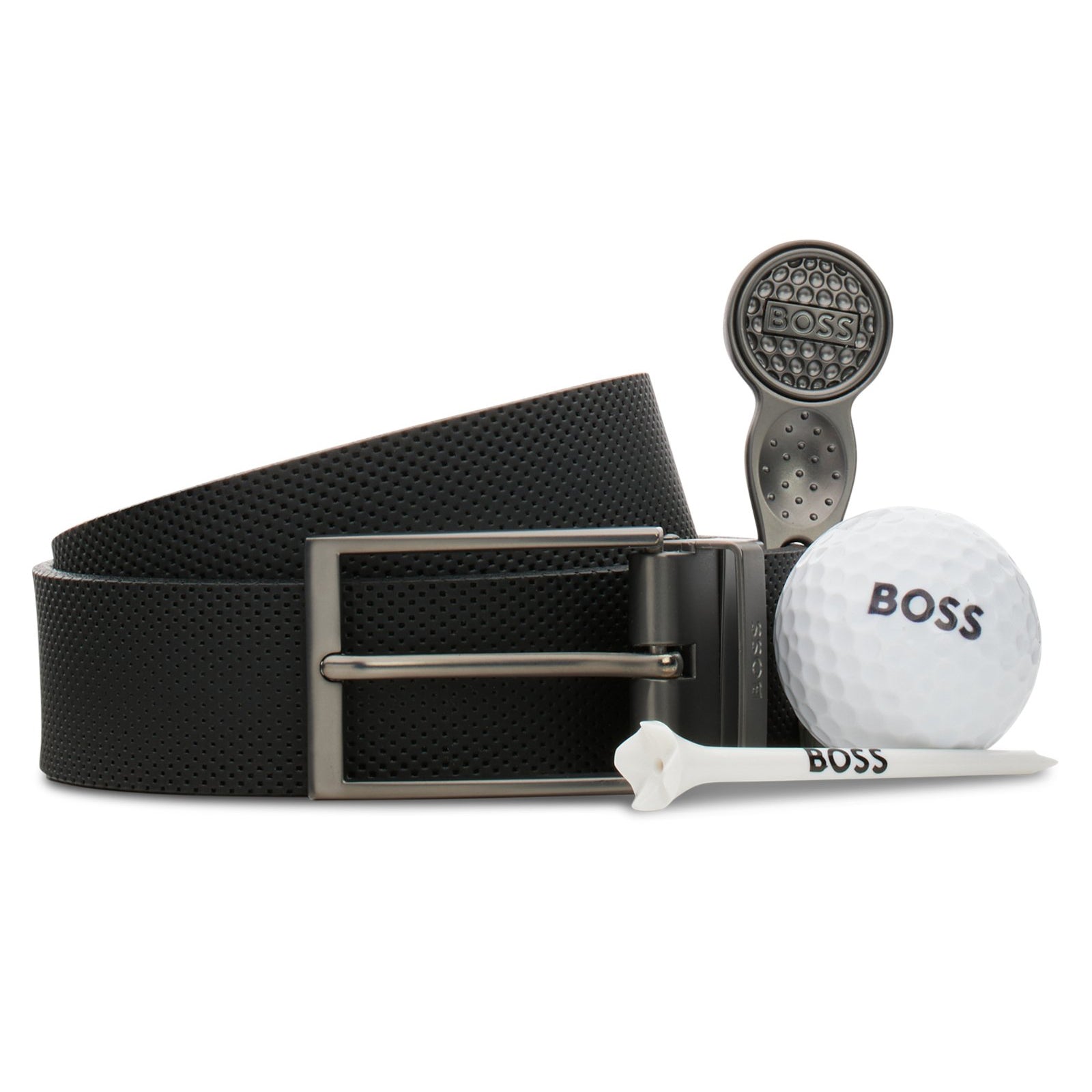 이탈리아 가죽, 브랜드 골프 티, 로고 볼 및 시그니처 디봇 수리 도구로 가역 가능한 3.5cm 벨트로 구성된 보스가 설정 한 현대 선물.
